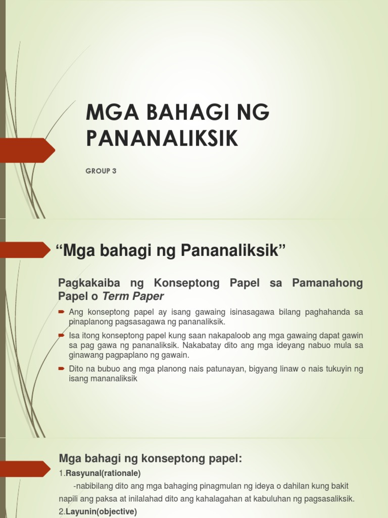 Bahagi ng konseptong papel. HAKBANG SA PAGBUO NG KONSEPTONG PAPEL. P pagsisiyasat A t pagsusuri sa mga ideya konsepto bagay tao isyu at iba pang ibig bigyang-linaw patunayan o pasubalian N ililinaw A t pinag-aralang Mabuti ang bawat detalye datos at.