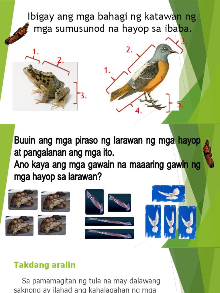 Ang mga hayop katulad ng aso kalabaw kambing baboy at pusa ay lumalakad tumatakbo lumulundag gamit ang kanilang mga paa. Hayop Mga bahagi ng katawan Aso Kabayo Manok Palaka Paru-paro Takdang-Aralin Igrupo ang mga hayop ayon sa bahagi ng kanilang katawan. Tubig na pinagpala walang makakuha kundi munting bata.